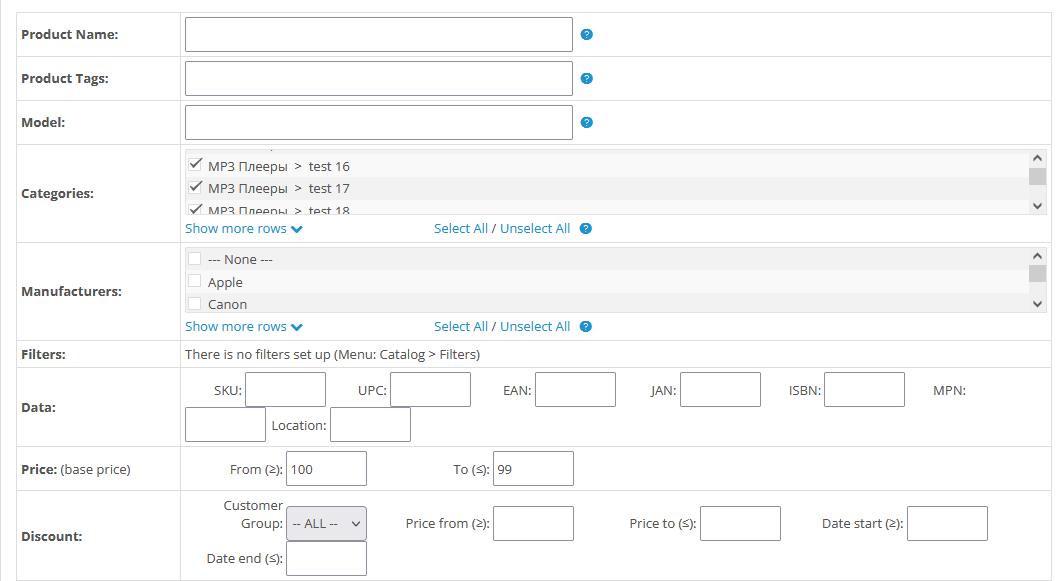 А так же производители, название, теги, или сделать специальные акции для групп клиентов даже в зависимости от даты регистрации. Фильтрация по всем полям.