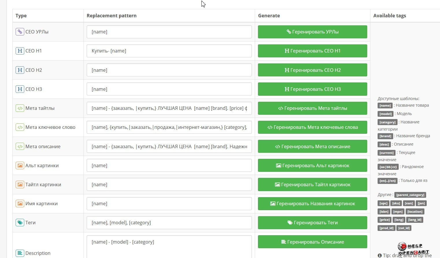 Тут, конечно, разработчики Молодцы генерация всех meta данных как вам угодно с подстановкой данных о товаре в заголовок или куда вы сами хотите. Можно создавать формулы как в старом модуле Paladin. В форму товара выведена кнопка для массового обновления данных, а режим симуляции записи данных позволит сгенерировать отличные заголовки и met описания.
