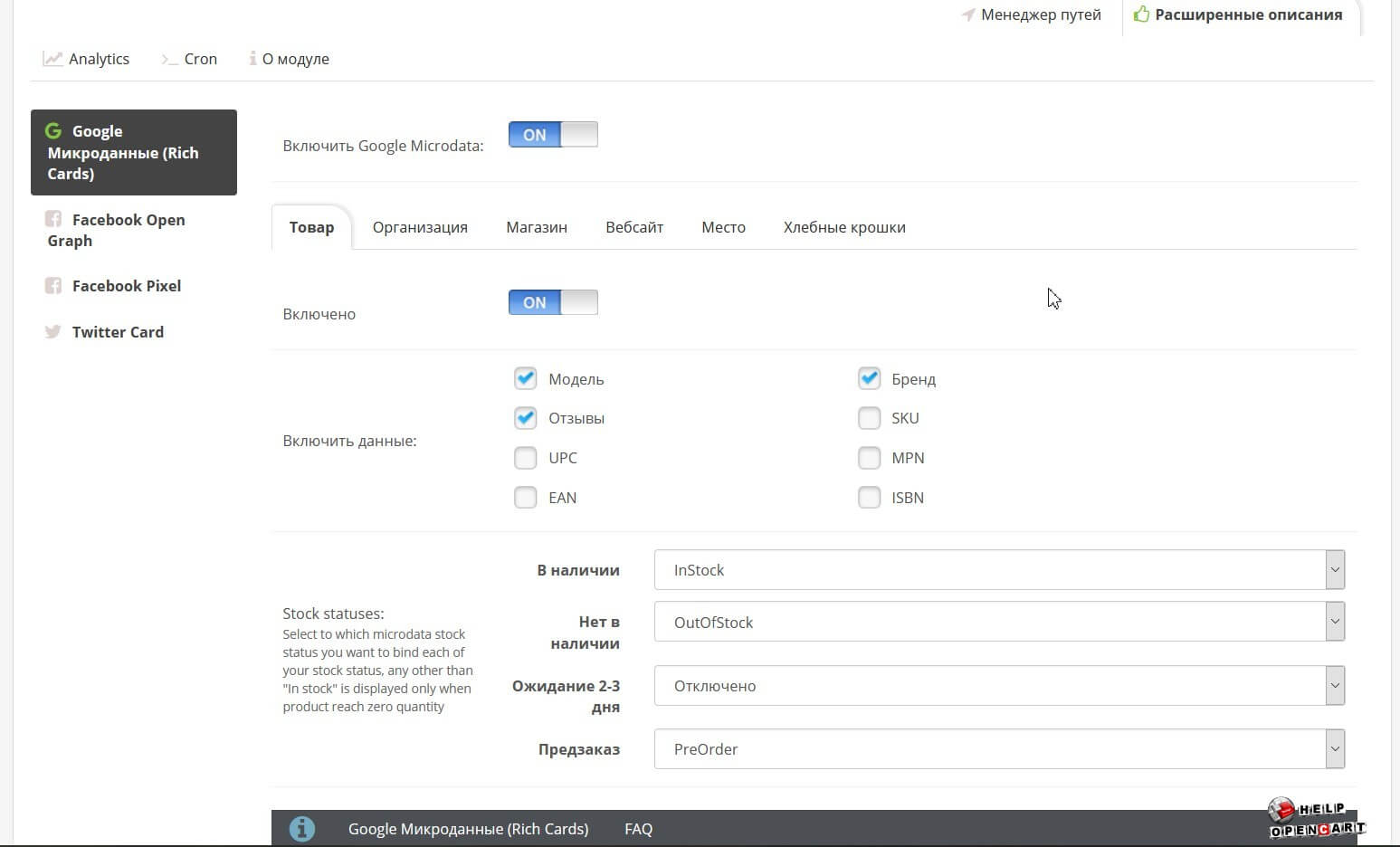 Еще отличная особенность модуля Google Microdata для страницы продукта, где вы можете указать какие данные передавать в поиск. С их помощью можно отобразить в поиске наличие, рейтинг, хлебные крошки, геокод, бренд, данные организации телефоны и адреса.