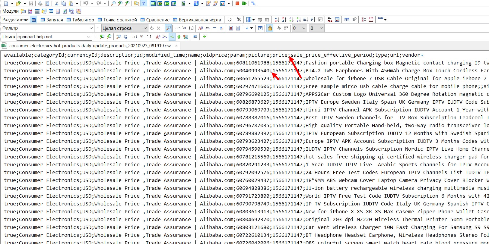 Для того чтобы. Загрузить товары в OpenCart Из простейшего формата CSV Нам понадобится сам файл и установленный модуль CSV Import PRO который можно скачать с нашего сайта. Установка модуля происходит через обычный штатный установщик дополнений, файлы не перезаписываются. Рассмотрим файл для импорта, он должен быть в формате CSV и единственное на что прошу обратить внимание это разделитель строк. Бывает запятая и бывает точка с запятой или также может быть любой другой символ. Чтобы это проверить откроем файл в любом текстовом редакторе, например EM Editor. На примере будем импортировать файл от партнерской программы Admit Ad, где будем забирать его по ссылке. И так открыв файл в редакторе видим, что разделитель у нас точка с запятой.
