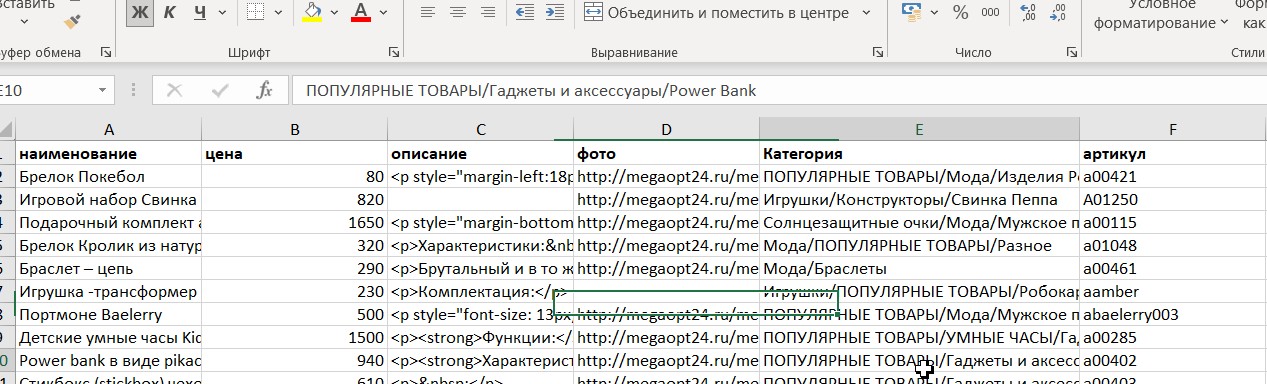 Видим первую строку: Наименование, цена, описание и т.д. Эти данные мы поставим в модуль для разметки что куда импортировать. Обращаю Ваше внимание что заголовки должны соблюдать регистр букв и точно совпадать с файлом.