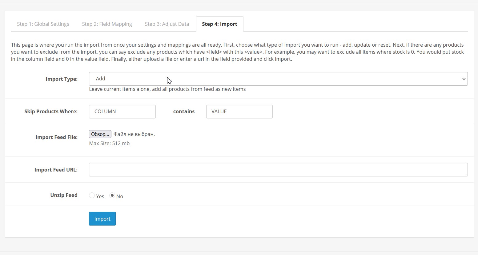 На этой странице вы запускаете импорт после того, как все ваши настройки и сопоставления будут готовы. Сначала выберите, какой тип импорта вы хотите запустить - добавить, обновить или сбросить. Затем, если есть какие-либо продукты, которые вы хотите исключить из импорта, вы можете сказать «исключить любые продукты, у которых есть <field> с этим <value>. Например, вы можете исключить все товары, у которых запас равен 0. Вы должны указать запас в поле столбца и 0 в поле значения. Наконец, либо загрузите файл, либо введите URL-адрес в соответствующее поле и нажмите «Импорт».
